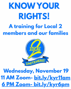 LOCAL 2: Know your rights! When federal agents invade our cities, we need to protect our jobs and our communities. Come to a training with UNITE HERE Local 2, Wednesday, November 19 @ 11am