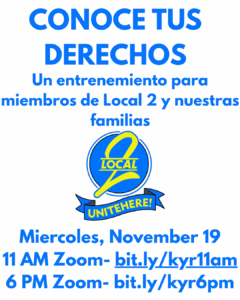 LOCAL 2: ¡Conoce tus derechos! Cuando agentes federales invaden nuestras ciudades, debemos proteger nuestros empleos y nuestras comunidades. Únete a una capacitación con UNITE HERE Local 2, el miércoles 19 de noviembre a las 11:00 am https://us02web.zoom.us/j/86832677993