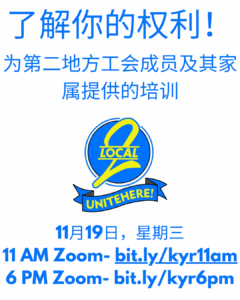 2號工会:了解您的权利!当联邦特工入侵我们的城市时,我们需要保护我们的工作和社区。请参加 UNITE HERE 2號工会于 11 月 19 日星期三上午 11 点在 Zoom 上举办的培训